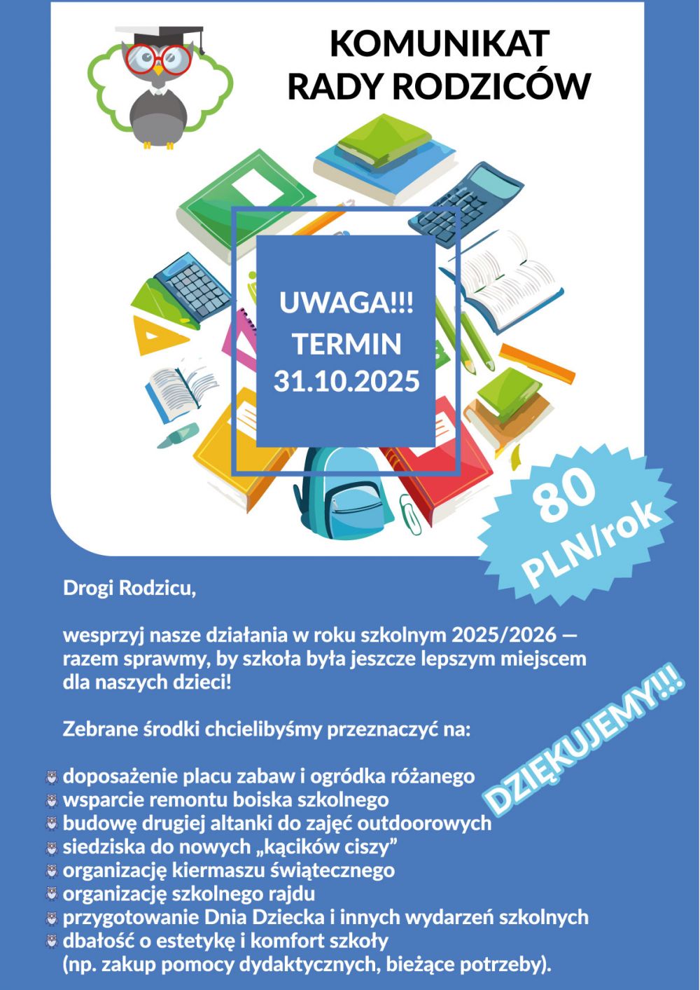 Prosimy o wpłatę składki w wysokości 80 zł za dziecko za rok szkolny 2025/2026.